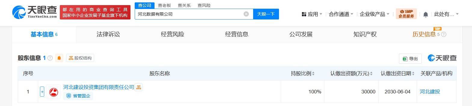 天眼查App显示,近日,河北数据有限公司成立,法定代表人为马涛,注册资本3亿人民币,经营范围含大数据服务、数据处理服务、数据处理和存储支持服务、互联网数据服务、信息技术咨询服务、信息咨询服务、网络与信息安全软件开发、信息安全设备制造、人工智能公共服务平台技术咨询服务等,由河北建设投资集团有限责任公司全资持股。
