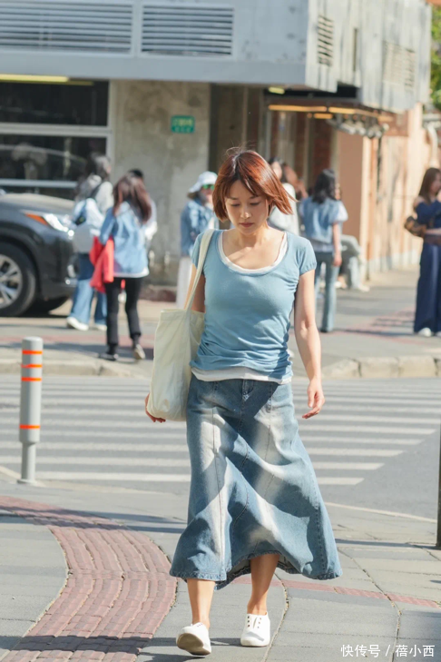 再看马伊琍这件蓝色t恤和牛仔半身裙的搭配,蓝色,宛如夏日晴空与大海的颜色,给人带来清新与宁静的感觉,能让白皙的肤色更显透亮。大领口和泡泡袖的设计堪称点睛之笔,增加了复古俏皮的风格,轻松体现了几分少女感,同时还能露出锁骨,遮挡住手臂上的拜拜肉,显瘦时髦两不误。