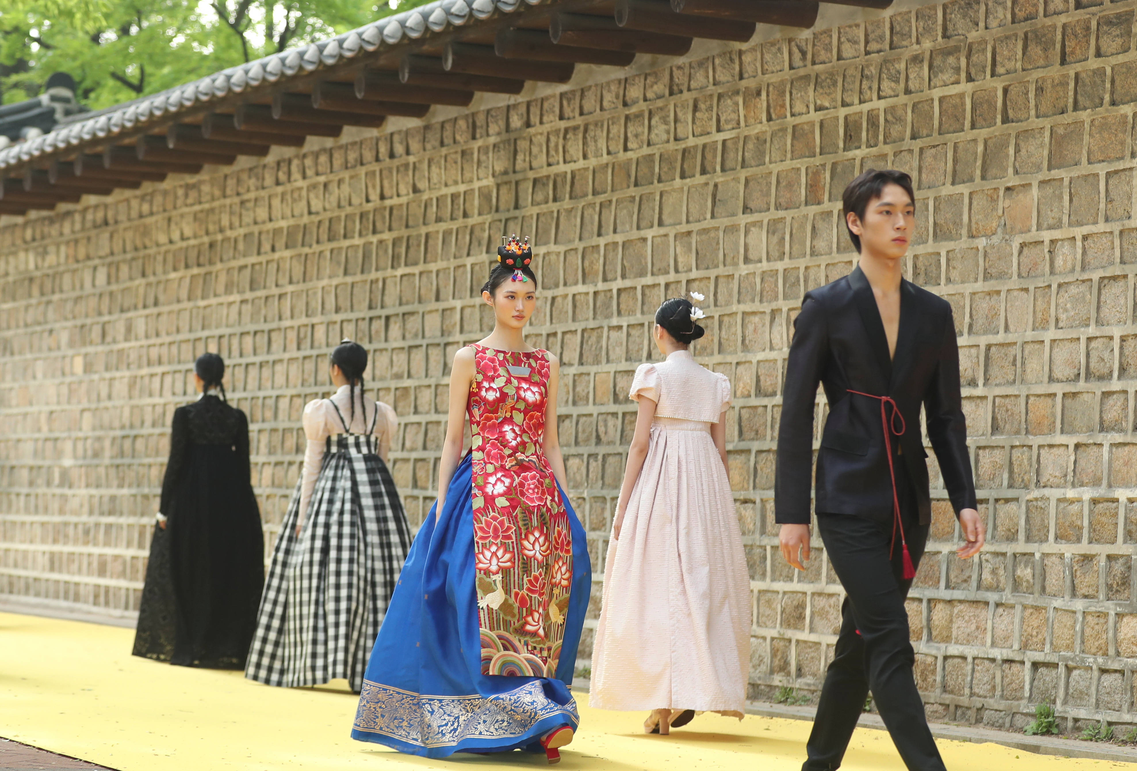5月2日,模特在韩国首尔德寿宫边的石墙路进行服饰表演。新华社记者姚琪琳摄