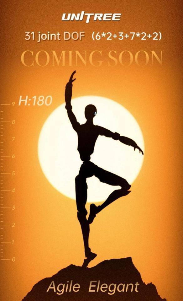 8月19日,宇树科技官方公众号曾放出一张预热海报,海报显示,该机器人高180cm,拥有31个关节自由度,具有Agile(敏捷)和Elegant(优雅)的特征,整体形象与今日公布的Unitree H2非常相似。