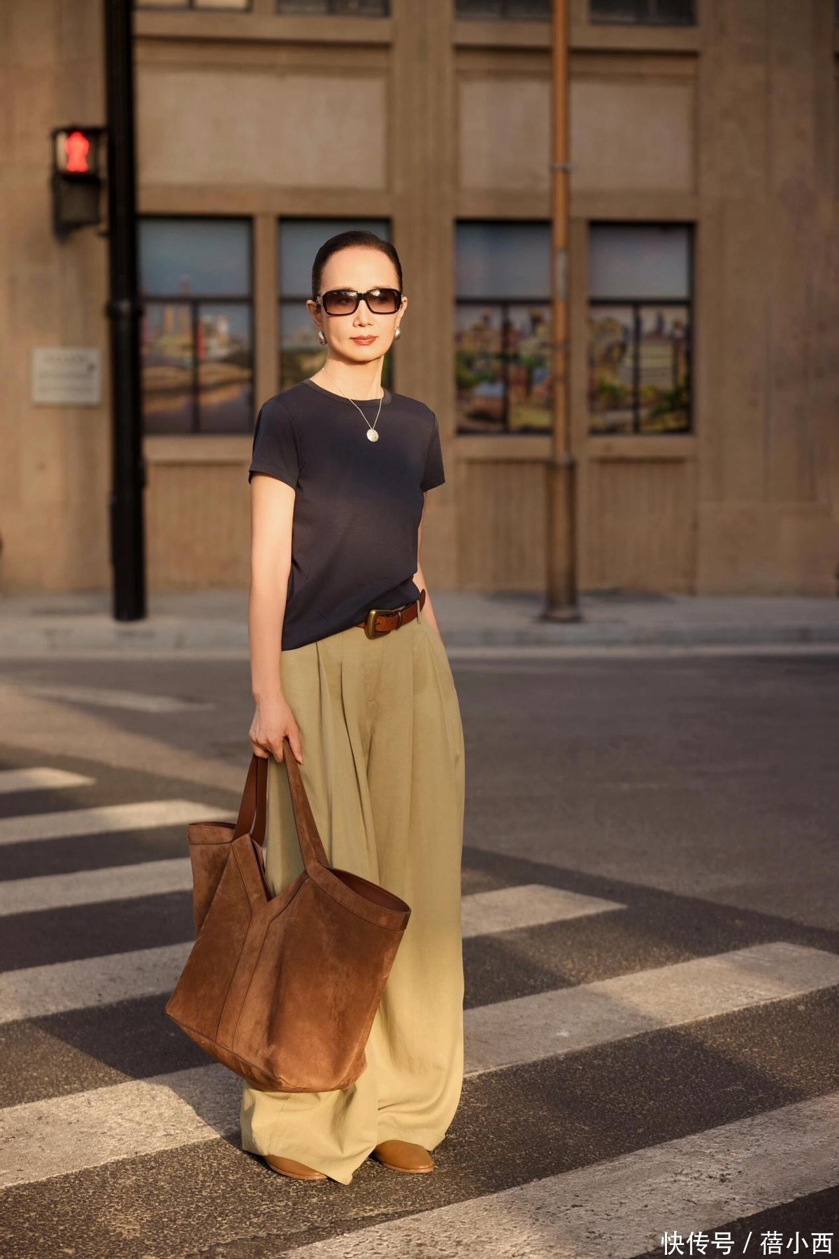 深色简约短袖,搭卡其阔腿裤,棕色皮带一收腰,慵懒又显比例。超大棕包、小项链点缀,普通单品秒变时髦。原来基础款这么厉害,普通人照搬这套公式,日常出街也能自带松弛高级感,轻松美成街头风景!