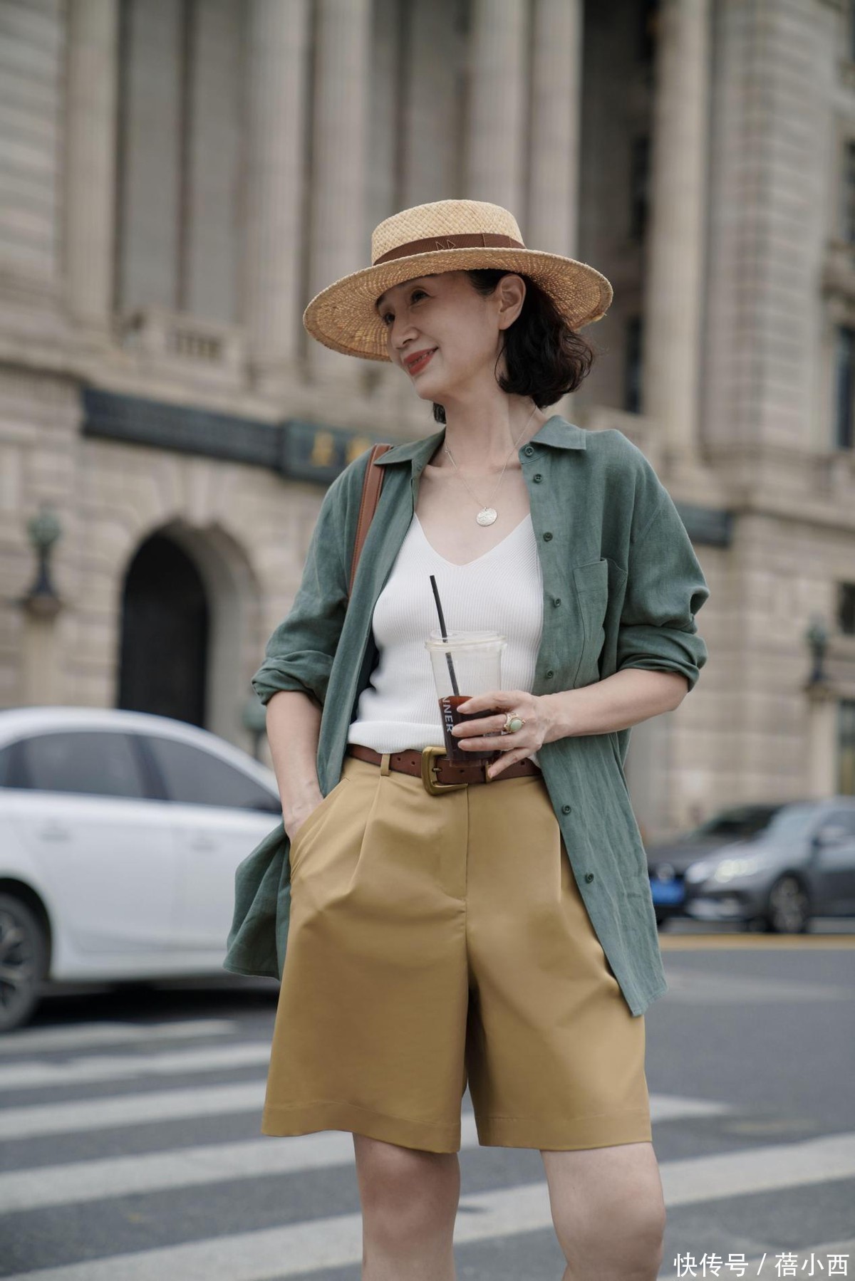 三木妈妈的穿搭尽显松弛感。草编帽营造度假氛围,绿色亚麻衬衫随性洒脱,内搭白色 V 领背心简约利落,卡其色中裤搭配棕色皮带,勾勒腰线,提升比例。整体配色和谐,材质天然,契合当下流行的 “户外休闲风”