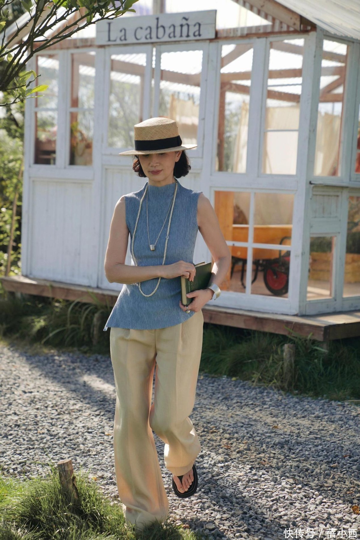 袖高领蓝色上衣,利落显气质;浅卡其阔腿裤,营造松弛感。草编帽增添度假氛围大满贯注册,多层珍珠项链、手持书本,丰富文艺细节。整体适配户外休闲场景,用基础单品搭配出优雅随性风格,契合当下流行的自然松弛美学,展现成熟女性的时尚品味 。